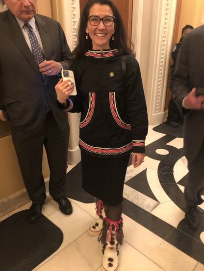 Alaska's US Representative-elect, Mary Peltola (D) in a Qaspeq (jacket) & Piluguk (boots) from her Yup'ik tribe yesterday at Capitol in DC.