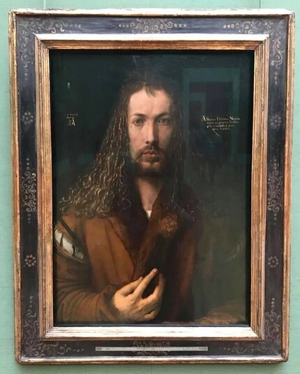 The painting has an inscription in Latin that reads: "Thus I, Albrecht Dürer from Nuremberg, portrayed myself with characteristic colors in my 28th year."