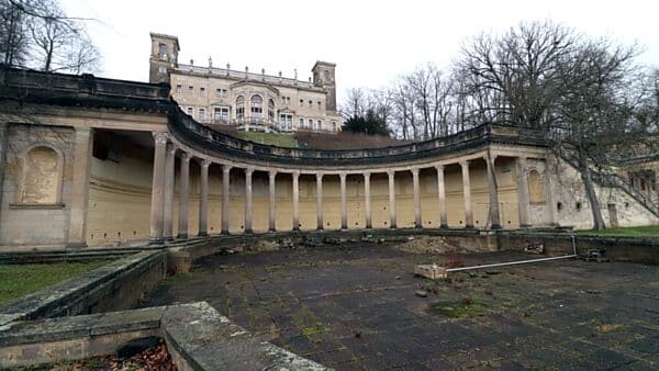 Es ist ein Trauerspiel. Große Sandsteinklötzer liegen wild in dem einst so schönen Becken herum. Die Sandsteineinfassung ist verwittert, rissig und bröckelt. Das Römische Bad am Schloss Albrechtsberg ist hinüber