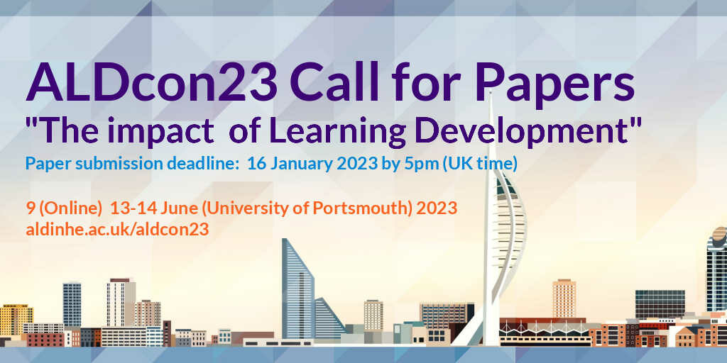 📢#ALDcon23 Call for Papers is open.📣Submission deadline: 16 Jan 2023 by 5pm (UK time). #ALDcon23 has 3 broad strands around the impact of learning development; please see http://aldinhe.ac.uk/aldcon23 for details. Save the date: 9 (online) & 13-14 June (@portsmouthuni) 2023 #LoveLD