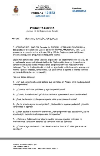 RT @JonInarritu@twitter.com: Hara! Espainiako Gobernuak dio ez dakiela ezer pasa den irailean Guardia Zibilak Arbizun ikurrinaren aurka eginiko erasoaz.