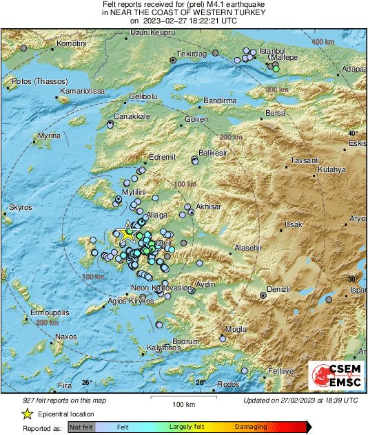 #Earthquake 28 km SW of #Aliağa (#Turkey) 17 min ago (local time 21:22:21). Updated map - Colored dots represent local shaking & damage level reported by eyewitnesses. Share your experience via: