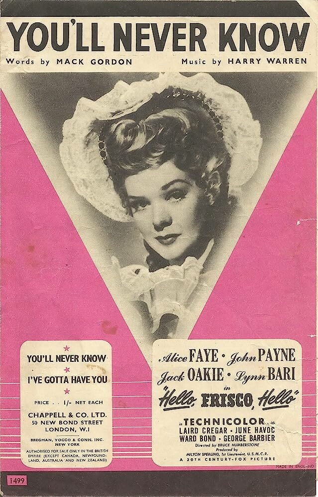 Few songs more emotionally affecting that Alice Faye singing “You’ll Never Know”