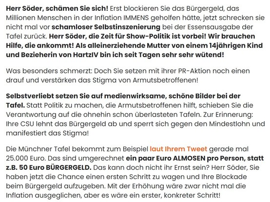Söder, Ihre #AlmosenShow bei der Tafel hilft nicht! Armutssicheres Bürgergeld, jetzt! https://chng.it/Xyg5mkMt via @ChangeGER@twitter.com