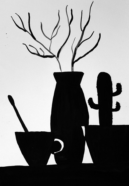 Сравните ширину верха и низа, размер чайника и чашки, чашка в три раза ниже чайника, значит и на рисунке рисуйте в три. Стена темнее чайника, но светлее ручки? Так и передавайте.