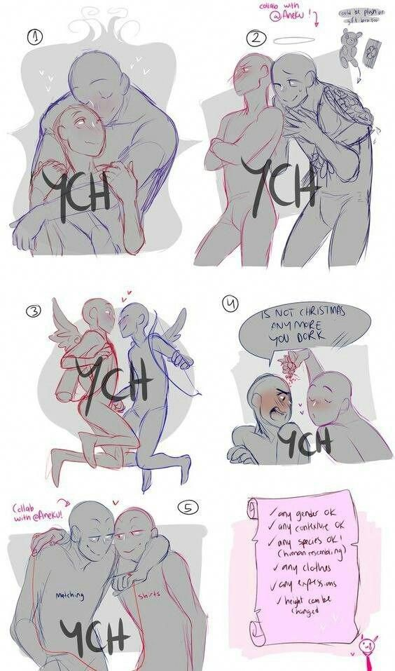 — Юйч, Юч (“YCH“, “Your Character Here“) — вид заказа, когда художник рисует персонажа клиента на основе заранее созданного скетча. Ючи продают и отдельно, как позы, и вы их видели на Pinterest. Впихивать в нарисованную кем-то позу своё уже полезнее, но это опять не работа с референсами.