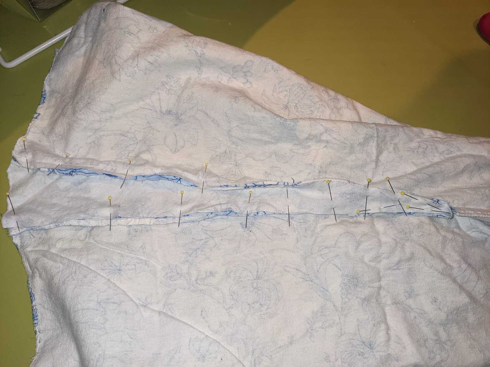 Today I'm altering some pyjamas I made in probably late 2020 -- I took a pattern from my then favourite pyjamas, made some in dark blue brushed cotton flannel, liked it, and made these in really warm brushed cotton in a blue-and-white pattern that makes me think of Asiatic Pheasant type transferware crockery.