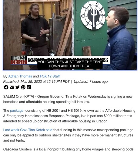 @andersem @GovTinaKotek OR's landmark housing legislation could open up abundance & innovation, & even help rapidly build permanent #alternativehousing for/with the unhoused, if guided: as seen in KPTV report today w/#CascadiaClusters I work with https://www.kptv.com/2023/03/29/oregon-governor-signs-new-200-million-homeless-spending-package-into-law/. #HB2001 (#OHNA) + #HB5019 #orleg https://twitter.com/andersem/status/1641164940290686976