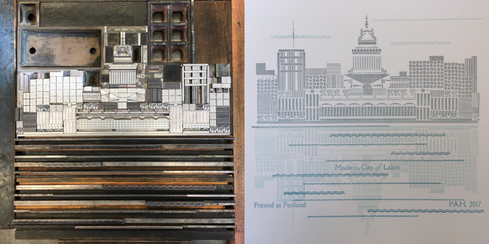 So what do I print with this equipment? I do a lot of work creating illustrations using type and type ornaments, which is a printing tradition that goes way back. For example, here’s a view of the Madison skyline from Lake Monona: on the left one of the type formes I aassembled and on the right, the finished print.