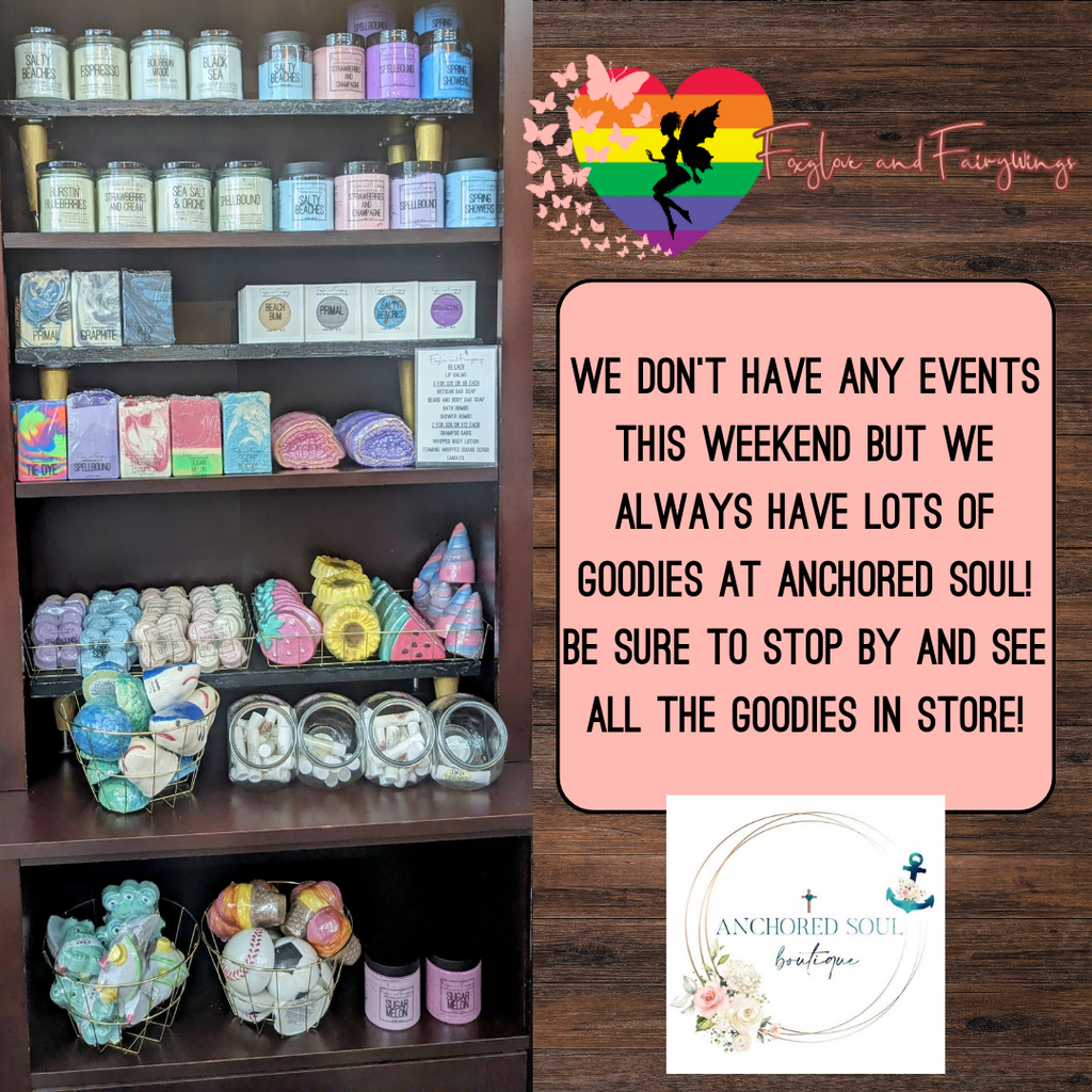 We don't have any events this weekend but we always have lots of goodies at Anchored Soul! Be sure to stop by and see all the goodies in store!