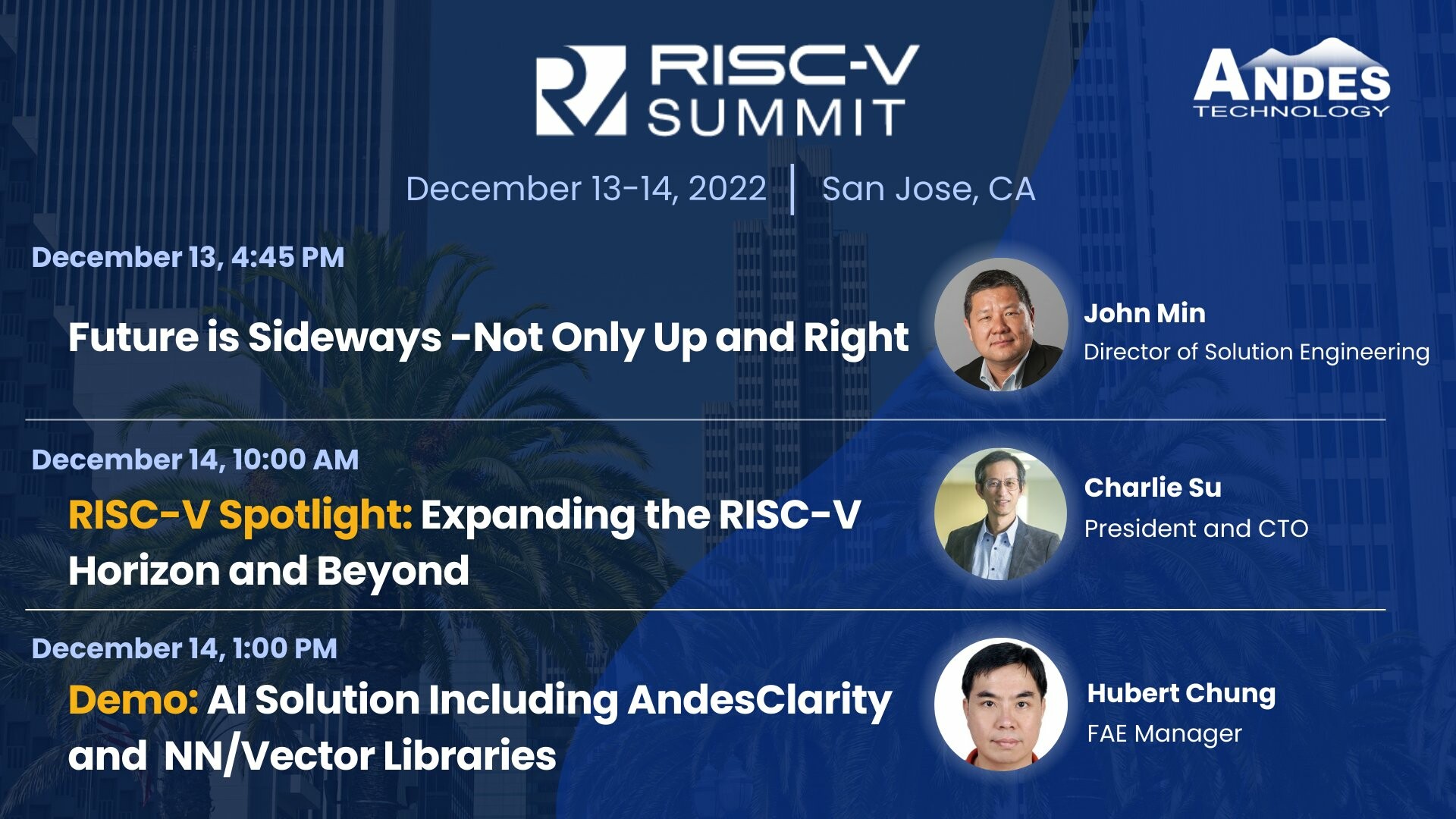 Join Andes Technology and the RISC-V Community at #RISCVSummit on Dec. 13-14 to learn more about Andes #RISCV #CPU solutions, roadmap, demos and more! Come visit #Andestech in person at booth D4 or virtually and join our presentations about RISC-V trend and applications!