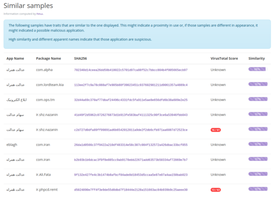 We updated https://beta.pithus.org to have more information on similar samples. This feature already allows you to discover cluster of data into Pithus' database. But now, we display as well information such as name, package name and possible VT score. One of the biggest feature of Pithus is cross-reference search and analysis of identical (or seemingly identical based on Dexofuzzy hashing) APKs. We keep working on improving that track.