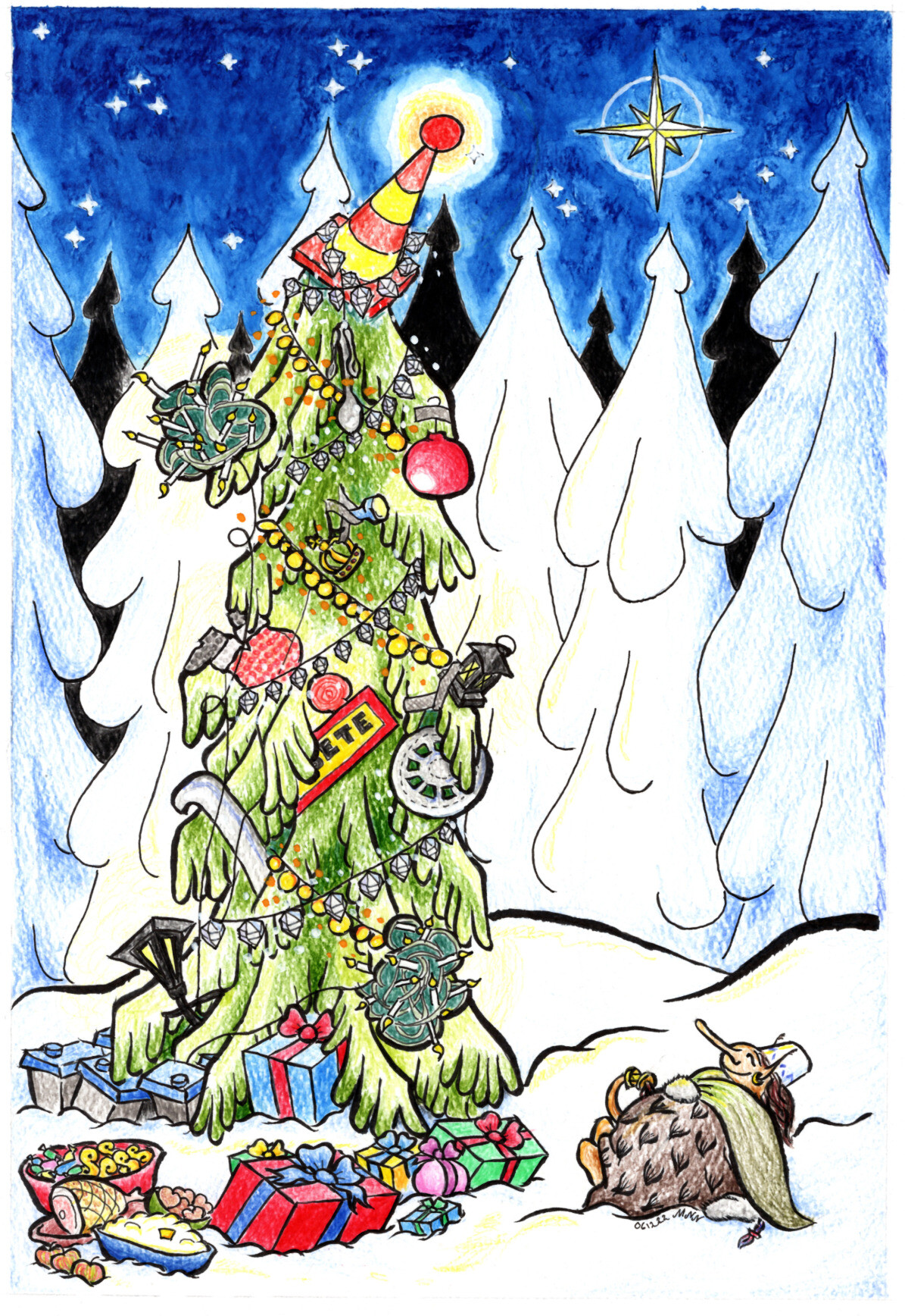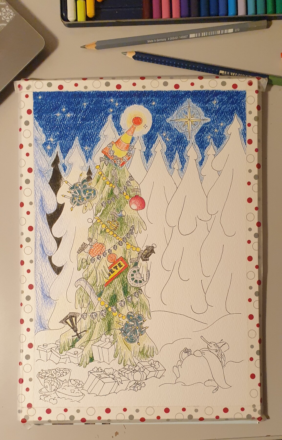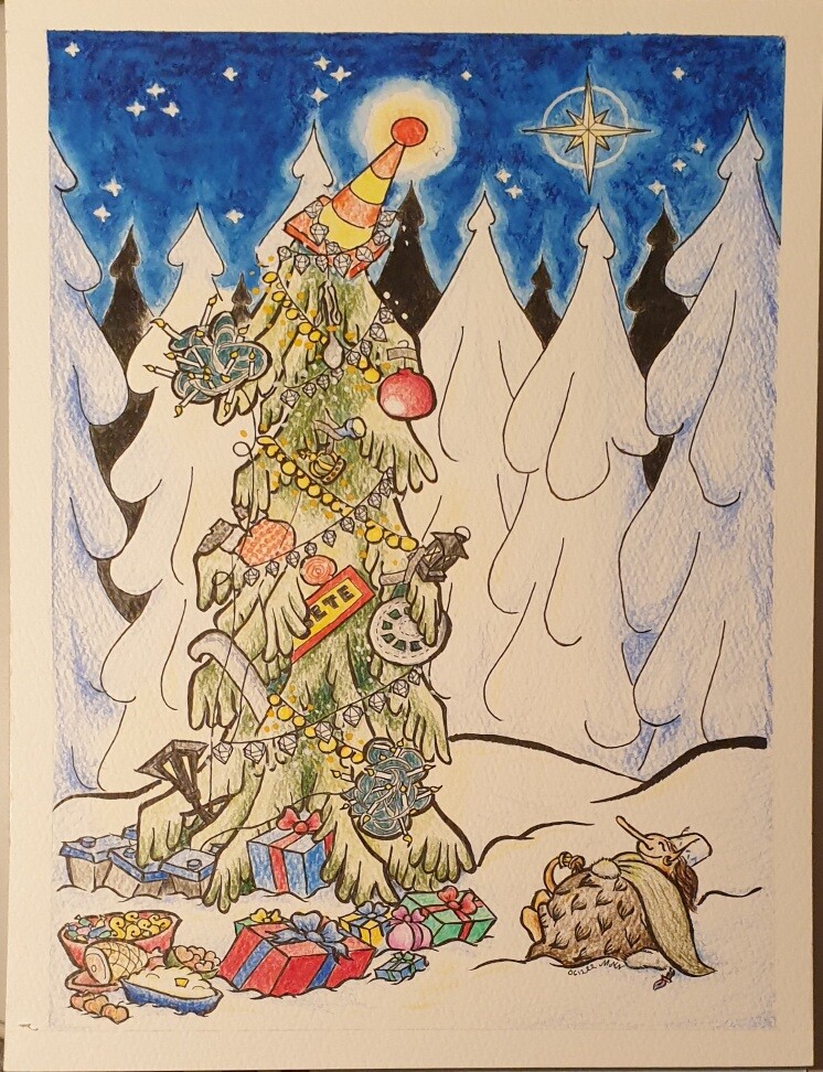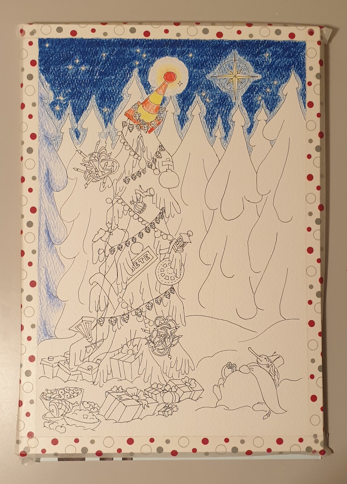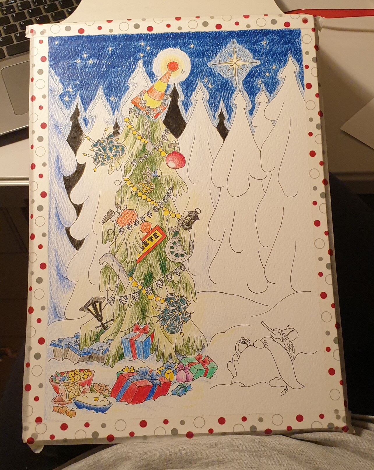 Tadaaa! The Ängsull Christmas Tree pic is finally finished! As a part of Figuring Things Out and rebuilding my stuff online I thought I'd sell digital downloads in my ko-fi shop.My original plan was printable Christmas cards, though I may do some digital wand waving and transform this into a wallpaper. Is this a good idea? (Poll in following toot.)