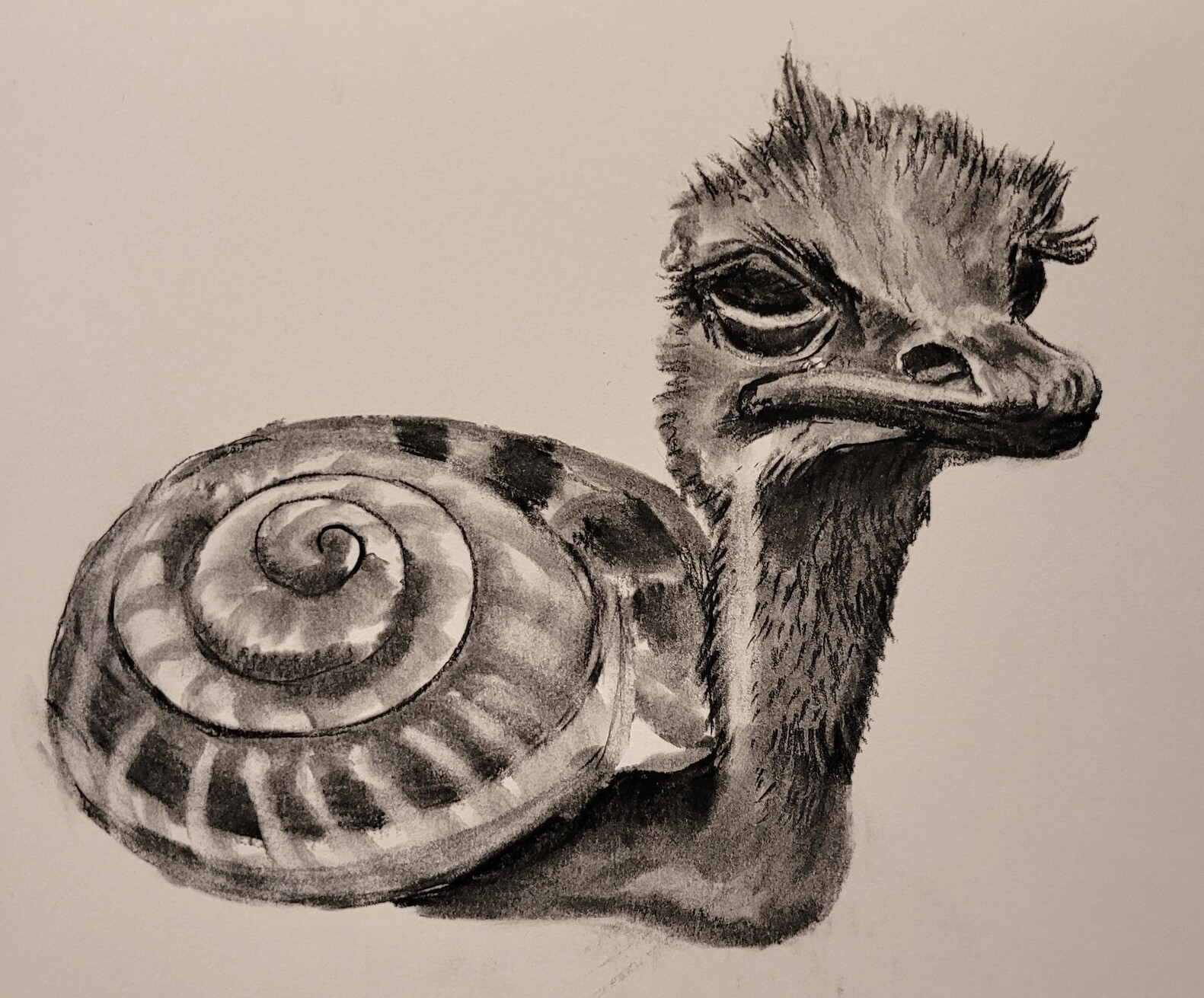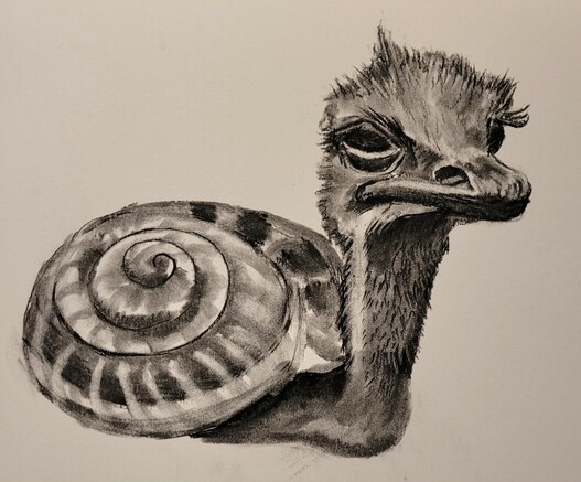 Don't blame me, this was asked for. Here's a charcoal snostrich. Also, since I really like this one, it counts towards my "Animal A Day" challenge. One bird and one snail with a stone, so to say.