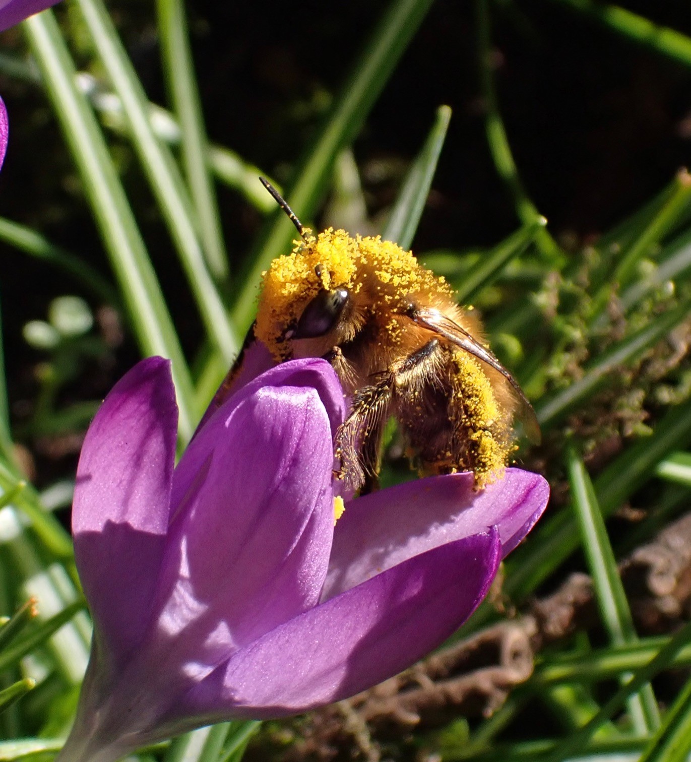 A male hairy-footed flower bee, Anthophora plumipes, dressed up in extra golden colours from the Crocus pollen it’s been feasting on http://www.inaturalist.org/observations/148190171