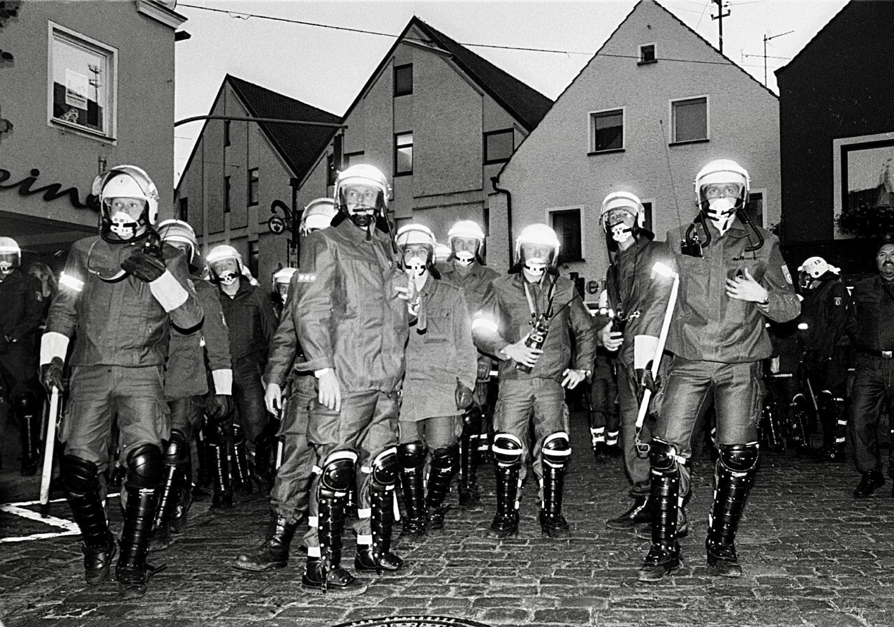 Alieninvasion im Dorf. Am Vorabend einer Großdemonstration am WAA-Baugelände löst das Berliner Sondereinsatzkommando unter Schlagstockeinsatz auf dem kleinen Wackerdorfer Marktplatz eine unangemeldete Kundgebung auf. Wackersdorf, 9.10.1987