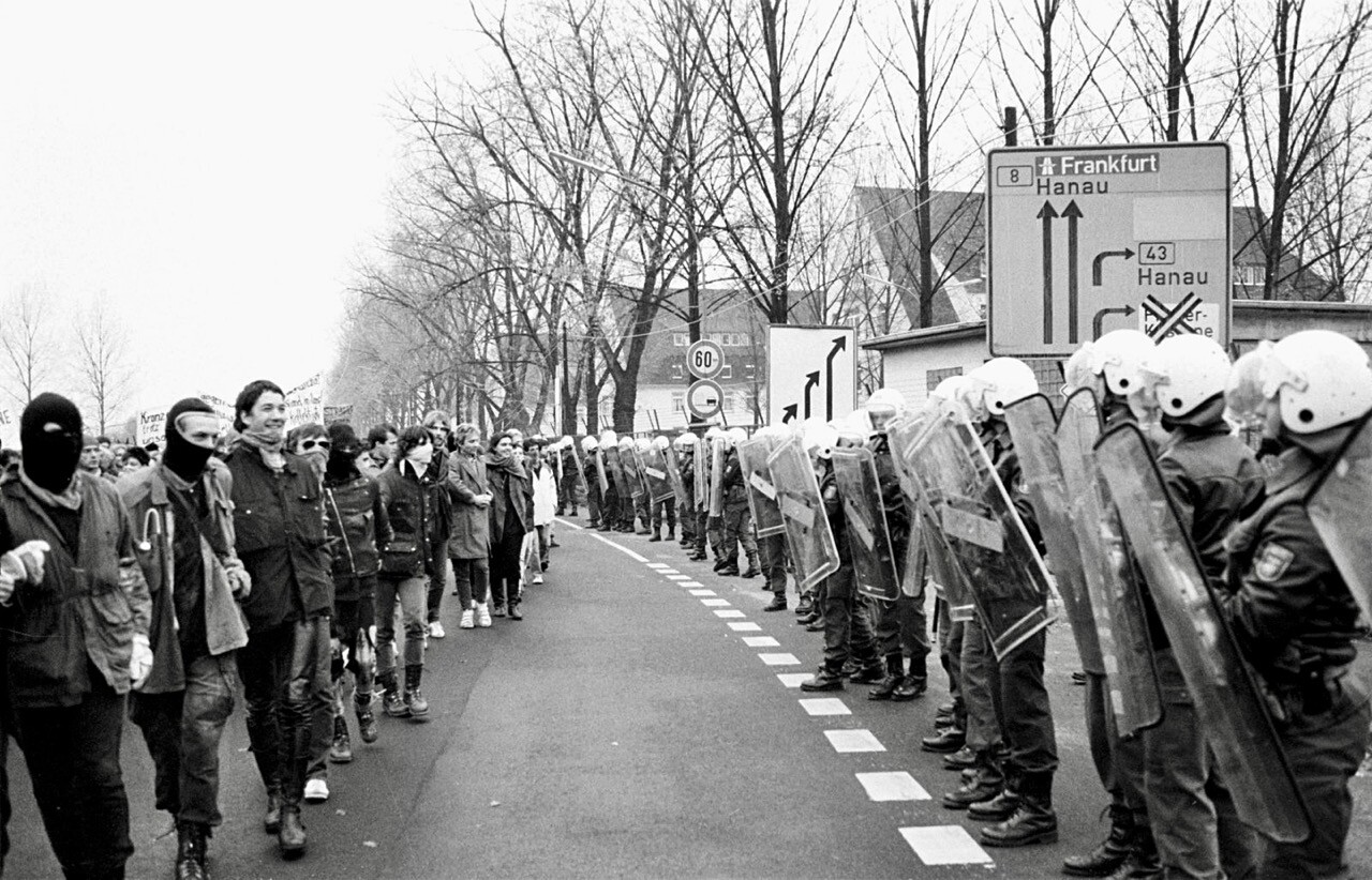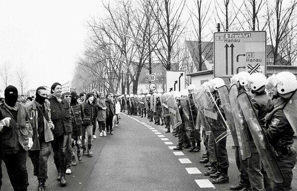 Demo-Choreografie der 80er Jahre. Hier: Demonstration gegen die Atomfabriken Nukem/Alkem in Hanau. Zwei Jahre später wurde die Anlage stillgelegt, u.a. wegen ungenehmigter Lagerung von Atommüllfässern. Hanau, 8. November 1986