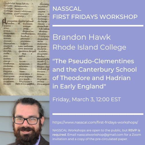 This Friday I’ll be presenting on “The Pseudo-Clementines and the Canterbury School of Theodore and Hadrian in Early England” for the NASSCAL First Friday workshop, at noon EST. It’s not too late to get the paper & zoom link—just DM me if you want them. #apocryphal
