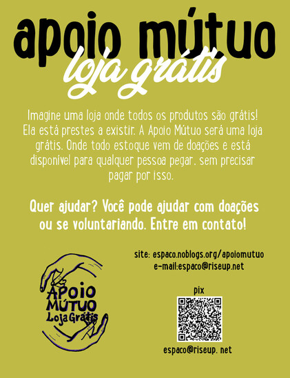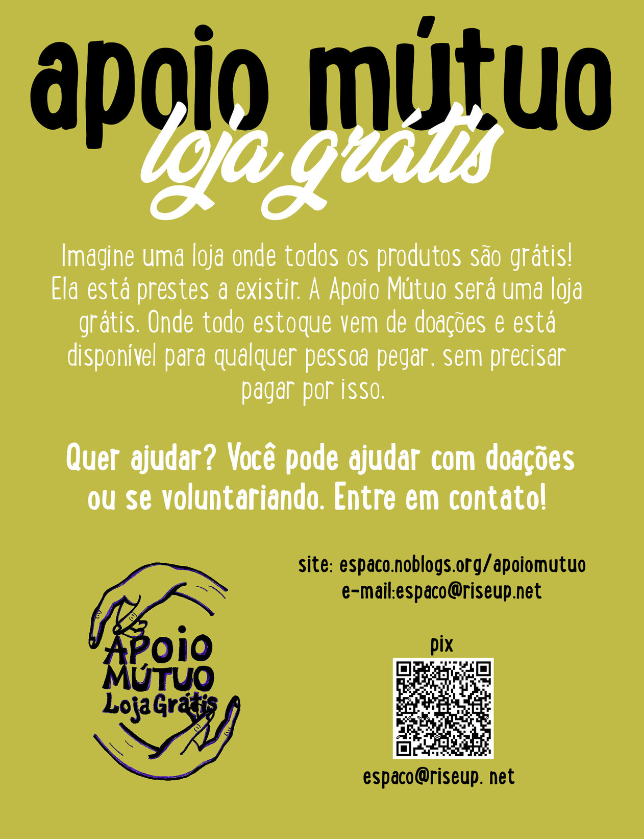Em breve o Espaço estará inaugurando a Apoio Mútuo, uma loja grátis, a primeira do tipo em Porto Alegre. Isso mesmo. Tudo nela estará disponível gratuitamente para qualquer pessoa. A ideia é fomentar o apoio mútuo e a solidariedade através da distribuição de recursos.