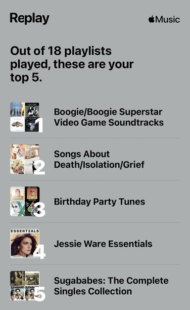 My top 5 listened to playlists according to my Apple Music Replay/Wrapped. 😃🥳😍🥰💖💙👍🎶