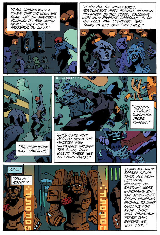 Some favorite comic pages from my #webcomic #Aquapunk! It's on hiatus right now, but the first 5 of 6 volumes can be read at: https://aquapunk.co