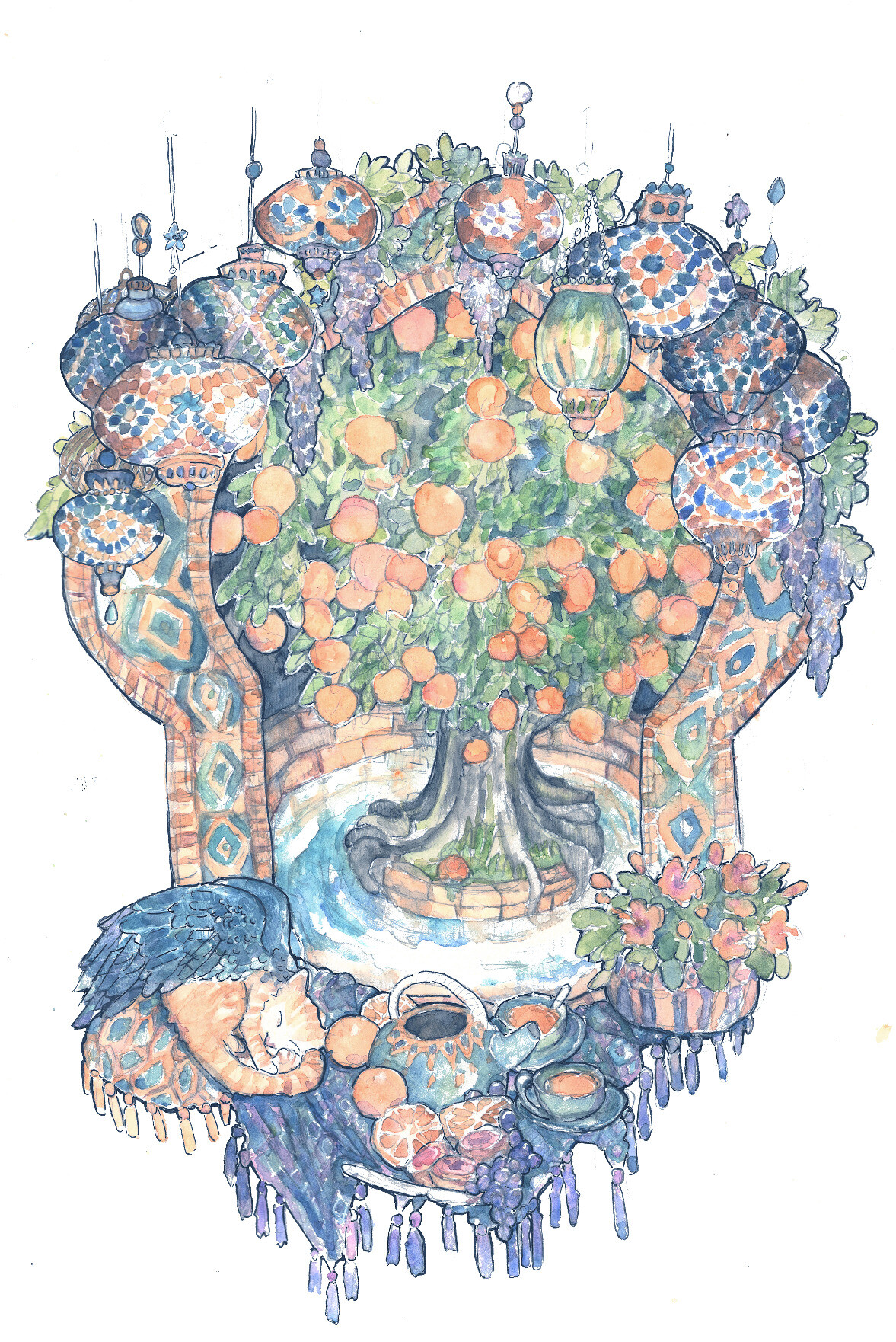 #summer #cats #CatsOfMastodon #tea #watercolor #ink #ginger tabby #orange #arabesque #art #illustration #MastoArt #FediArt #CreativeToots