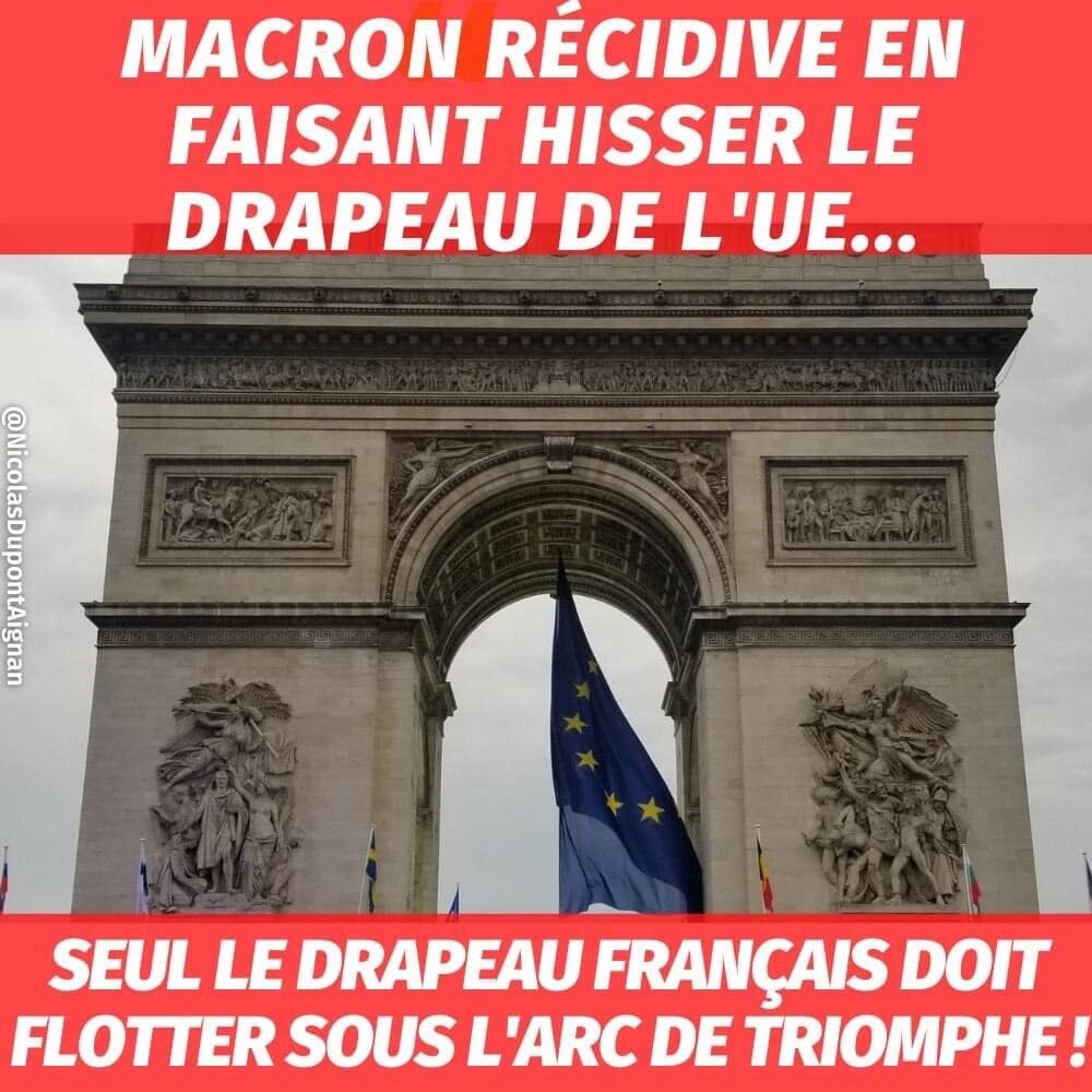 #Macron récidive pour la 4ème fois en faisant hisser le drapeau de l'Europe sous l'#arcdetriomphe... seul le drapeau de la France doit pouvoir flotter au dessus de la tombe du Soldat inconnu !