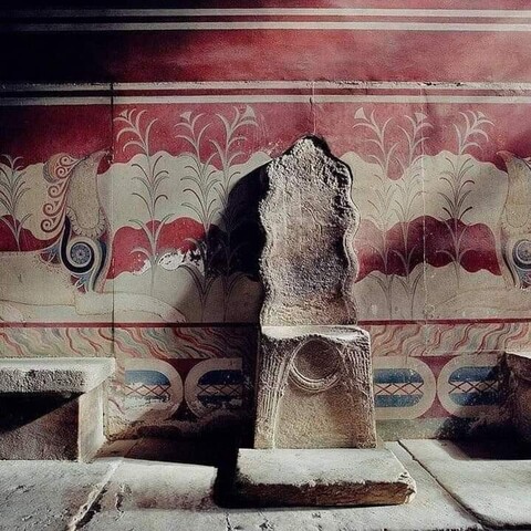 The oldest throne room (15th Century BC) in Europe, at the heart of the Bronze Age Minoan Palace of Knossos, Crete, Greece.