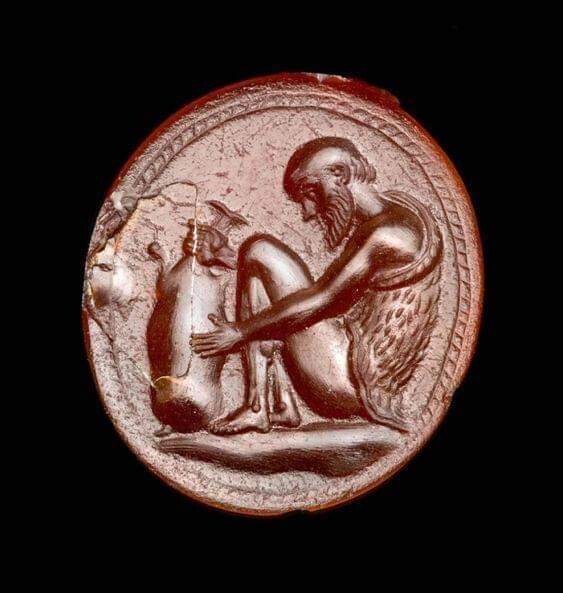 Orange-red carnelian depicts Silenos, bald, bearded and wearing an animal skin, sitting in profile to right. He holds opening of a full wineskin with his right hand and steadies container with his left.
