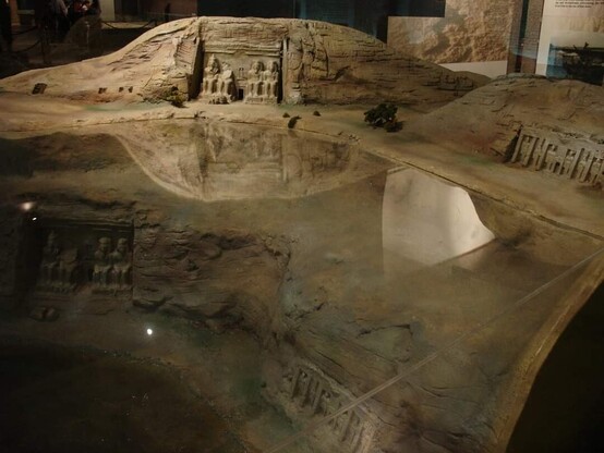 A scale model showing the original location of the 13th Century BC Abu Simbel temples, the site submerged under reservoir water since the 1970s, and the rescued and relocated temples' new higher sites.