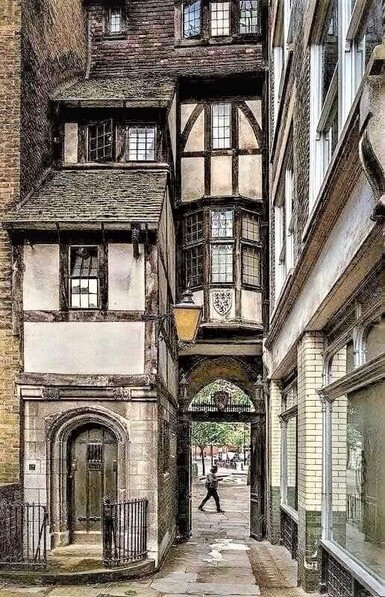Earliest surviving timber framed facade in City. It comprises a two-storey 16th Century CE, Tudor building with parts of stonework and archway from 13th Century CE. It was gatehouse to Norman Priory church of St Bartholomew the Great, founded in 1123 CE.