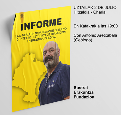 Bihar, arratsaldeko 19:00etan, Antonio #Aretxabala geologoa Nafarroako meatzaritzari buruzko txostena aurkeztuko du @katakrak54 aretoan!!