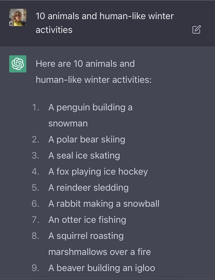 Today was playing with chat.openai and asked it to help me with a list of winter actions + characters, to break my art blosk. And it gave me actually very nice list of prompts to draw. All fears come true. I’m fulfilling tasks from AI. 😅