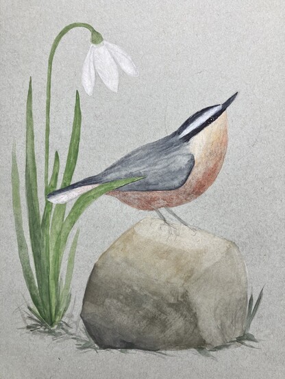 Today, this little nuthatch came to me. This is still a #WorkInProgress with #graphite and a couple of layers of #watercolour laid down. After it dries, I will finish painting details like the feet and eyes. After that, I’ll use #ColoredPencils to deepen the values and add texture to the piece.