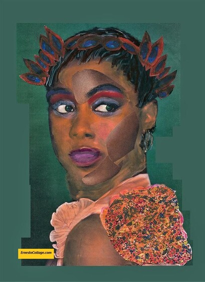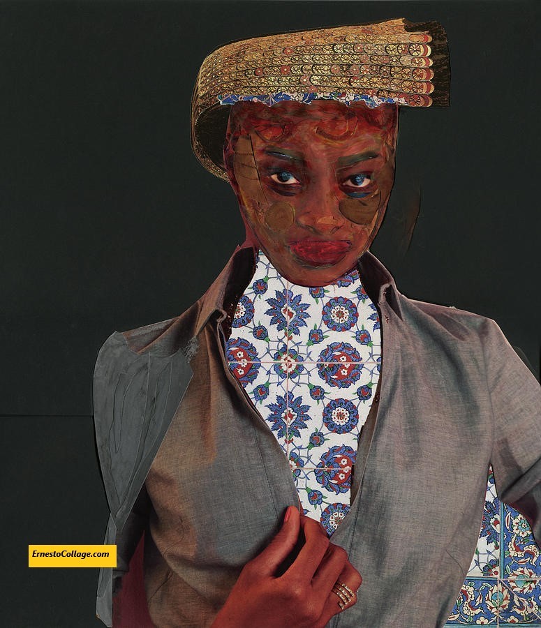 Blue Tile Shirt. This collage depicts a woman in a powerful pose, wearing a golden crown and a shirt with blue patterns reminiscent of Islamic tiles. Handmade with paper, watercolor and pastels