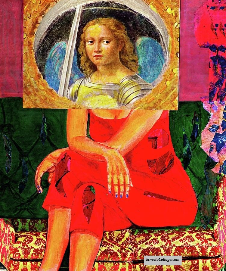Focus of Attention. All dressed up, self-conscious, looking your best, bighting your nails, and feeling both in life and in your inner space that you are the focus of attention. Collage from paper and watercolor.
