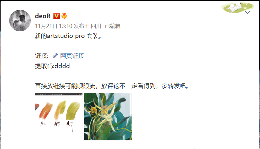 顺便再安利下!如果有用artstudio pro的友友,务必去下载deoR老师制作的artstudio pro专用笔刷!!!里面的仿派通笔刷手感好得不得了!!正好最近这个笔刷套装还更新了。