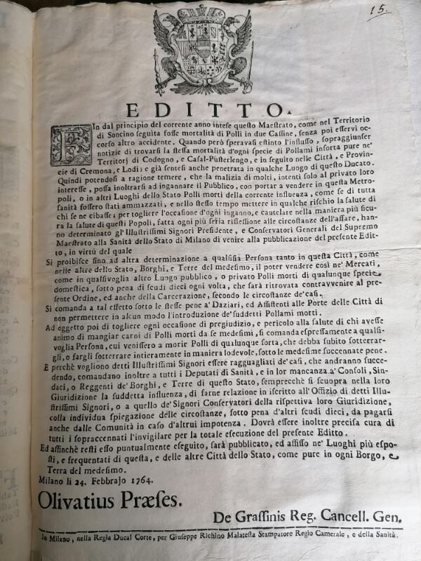 ๐บ๏ธ Febre aviaria, interdiction de vender pullos vivente. Milano, 1764