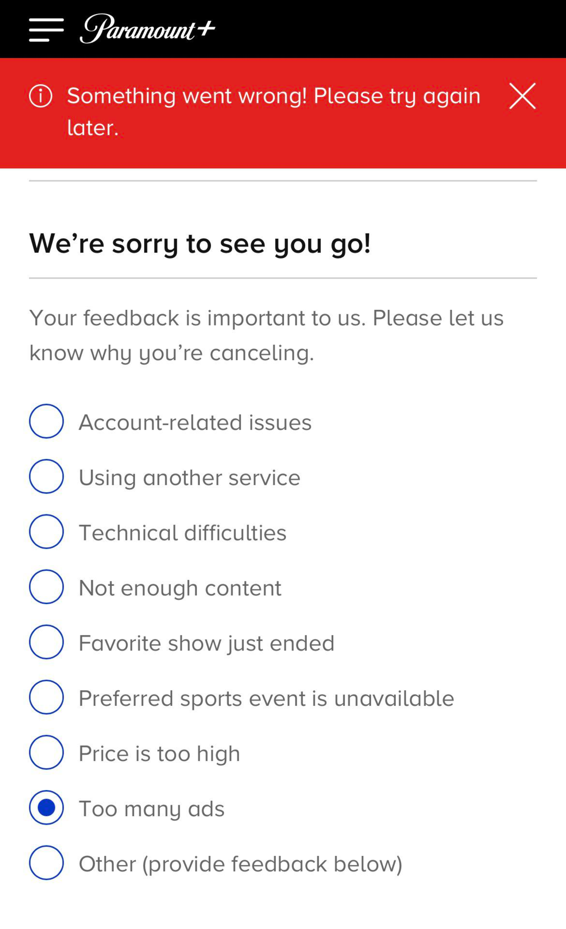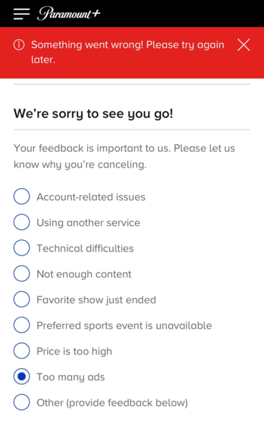 Trying to cancel my Paramount + account, it’s been like this for weeks.