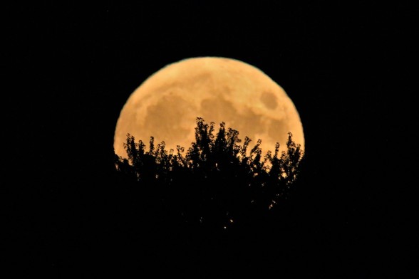 Today's #ArtAdventCalendar bonus photo. The Aug. 11, 2022, supermoon rises from behind a treeline. Wolverine Lake, Michigan.