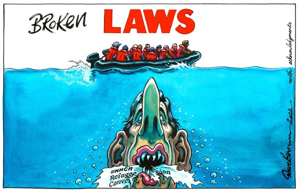 Dave Brown on #RishiSunak #AsylumSeekers #AsylumLaws #UNHCR #1951RefugeeConvention #Refugees - political cartoon gallery in London original-political-cartoon.com