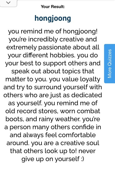 I just got result 'hongjoong' on quiz 'which ateez member are you?'. What will you get? https://uquiz.com/quiz/tRv0rV?p=1618666
