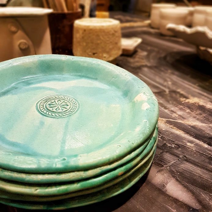 Bevor demnächst die Sommerpause anfängt, habe ich heute endlich unsere neuen Abendbrotteller abgeholt. Die Glasur ist wieder "Lagune" in matt. Neu entstanden und ohne Bild sind heute ein paar Eierbecher.