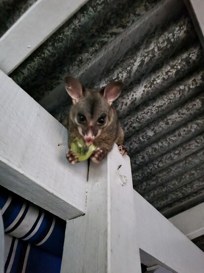Only one possum in the airbnb today. The friendly one with the chewed left ear. Just given her some apple for dinner before she heads out for the evening. #australianbrushtail #possums #AustralianFauna