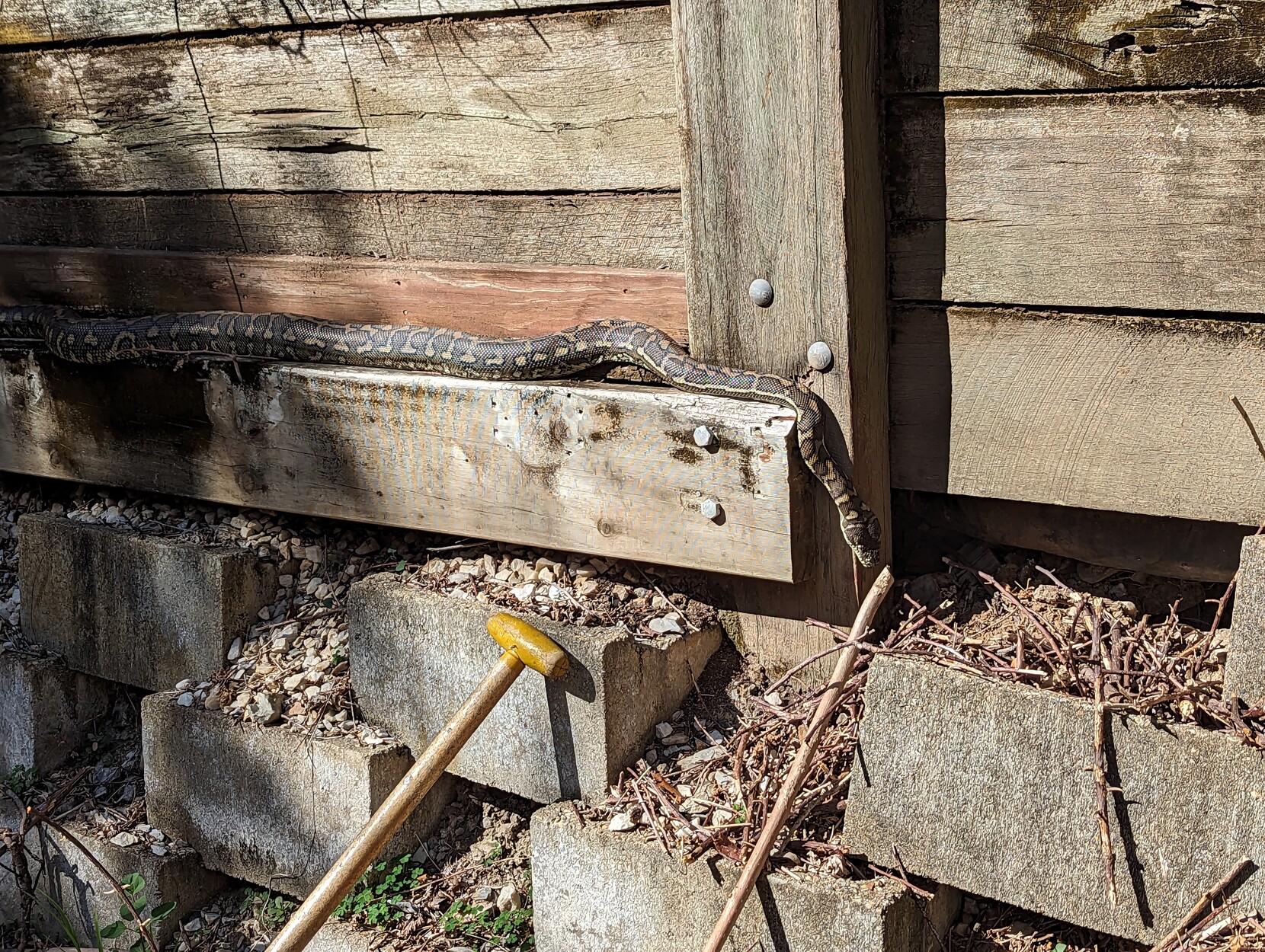 Oh I haven't posted about our carpet snake visitor. Every day for the last week it has been sun baking along the retaining wall and then tucking itself back inside it again.