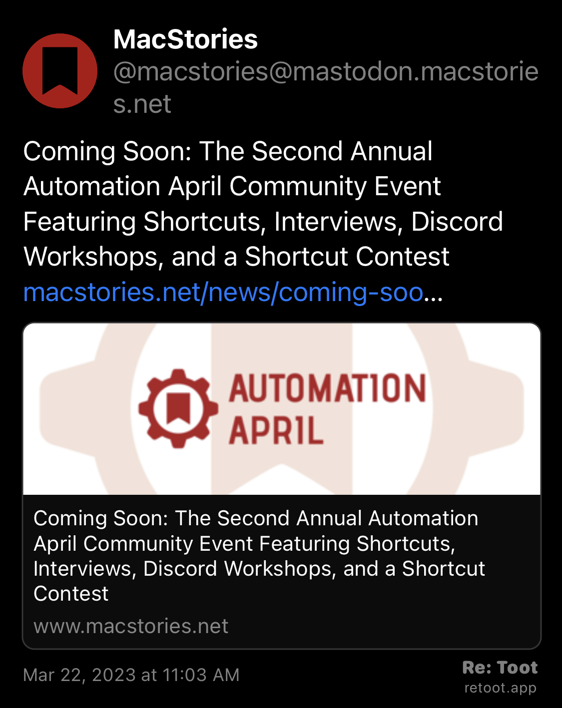 excited that @macstories is back with #AutomationApril - also shocked that it’s nearly April again 😂