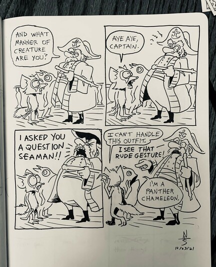 The Sketchies are an #AyeAye and a Panther #Chameleon , because Aye Ayes look whacked out (first gag was about trippin) and PCs are also from #Madagascar #art #sketchbook #comicstrip #MastoArt