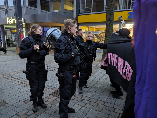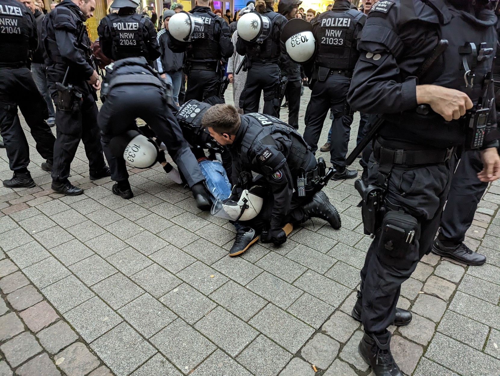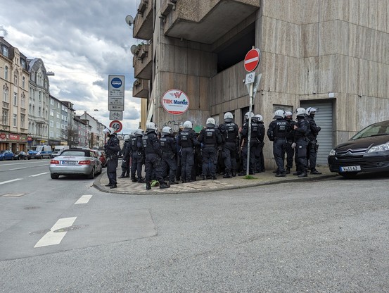Es ist eine größere Gruppe in #Wuppertal eingekesselt worden. Sie sollen mit Pyrotechnik auf die Straße gelaufen sein. Den Menschen wird Landfriedensbruch und Vermummung vorgeworfen. Nacheinander werden die Menschen jetzt durchsucht und vermutlich auch festgenommen. #AZGatheBleibt