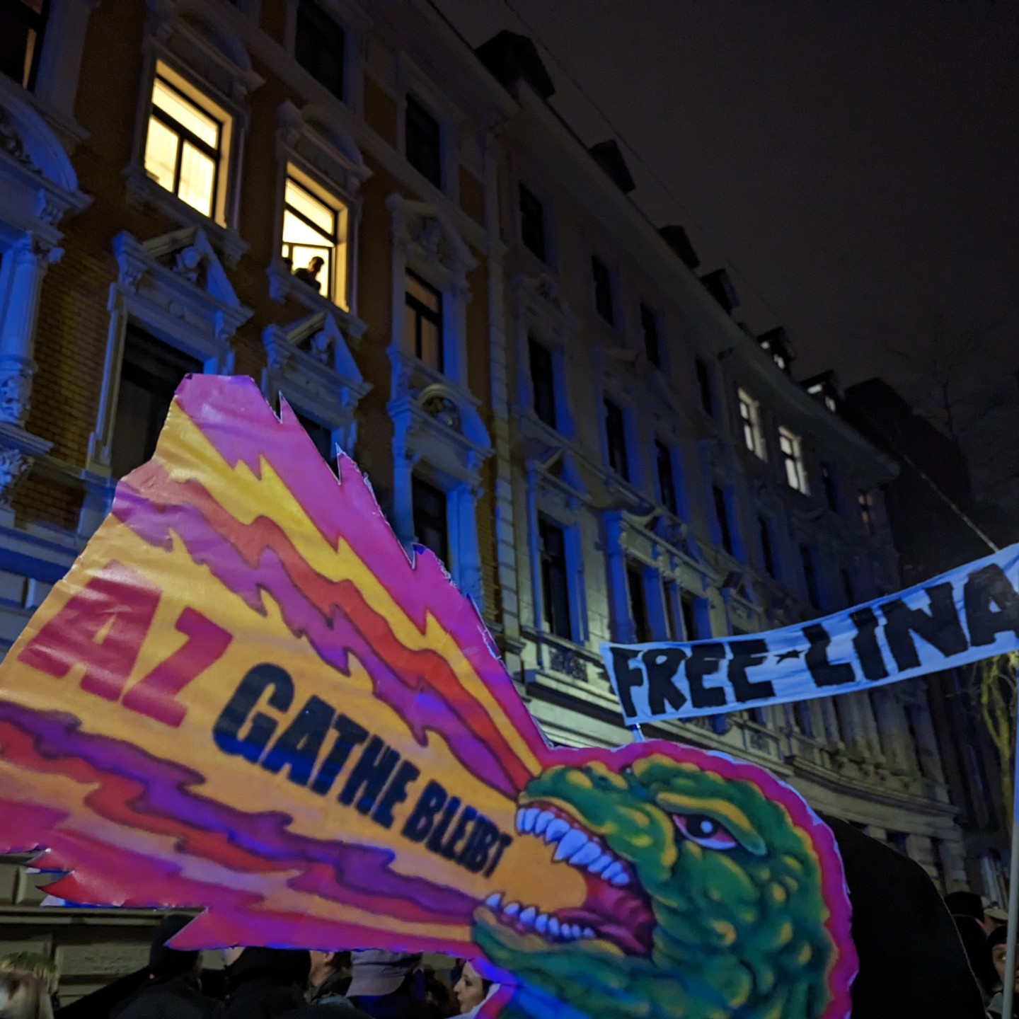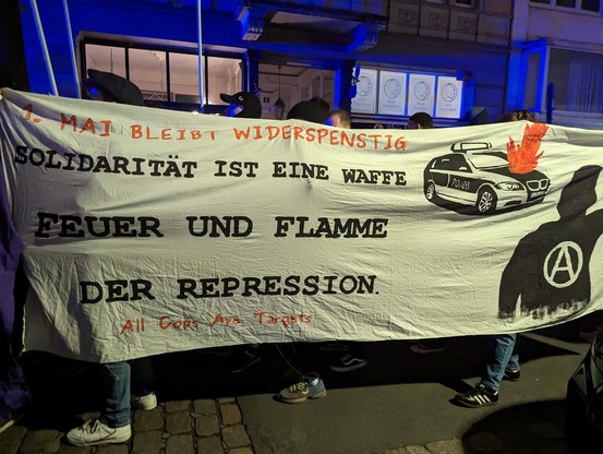 Jetzt hat die Polizei die Demonstration für das Autonome Zentrum gestoppt. Sie hat auf diesem Transparent einen Aufruf zu Straftaten erkannt. #Wuppertal #AZGatheBleibt