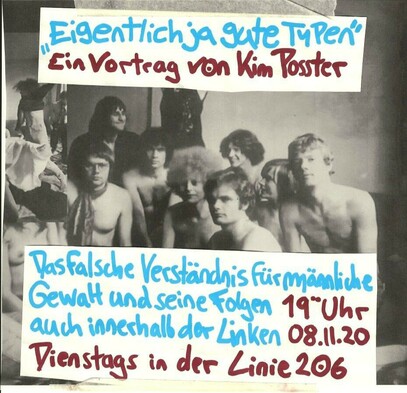 "Eigentlich ja gute Typen" - Das falsche Verständnis für männliche Gewalt und seine Folgen auch innerhalb der Linken Ein Vortrag von @KPosster@twitter.com am #b0811 in der @linie206@twitter.com